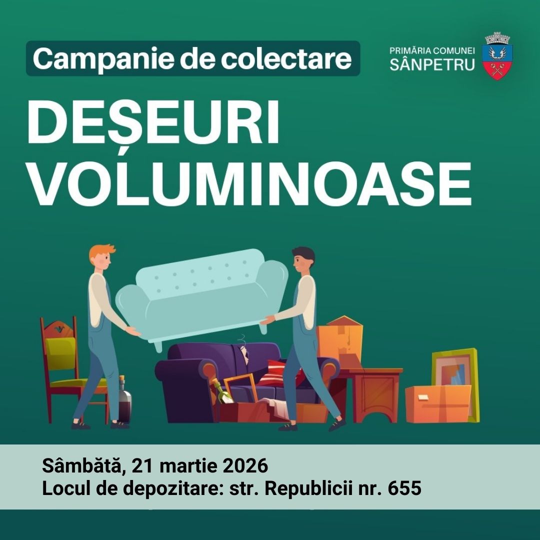 Continuăm campania de colectare a deșeurilor voluminoase în Sânpetru Primăria Comunei Sânpetru organizează o nouă etapă a campaniei de colectare a deșeurilor voluminoase. Data: Sâmbătă, 21 martie 2026 Locul de depozitare: Str. Republicii nr. 655 În cadrul acestei campanii pot fi predate gratuit: mobilier vechi (canapele, dulapuri, mese, scaune etc.) saltele obiecte sanitare covoare alte […]